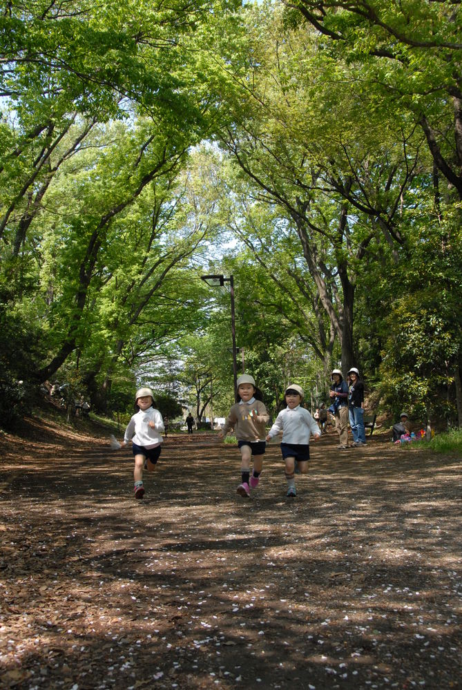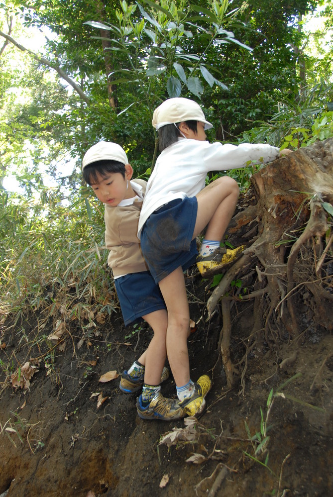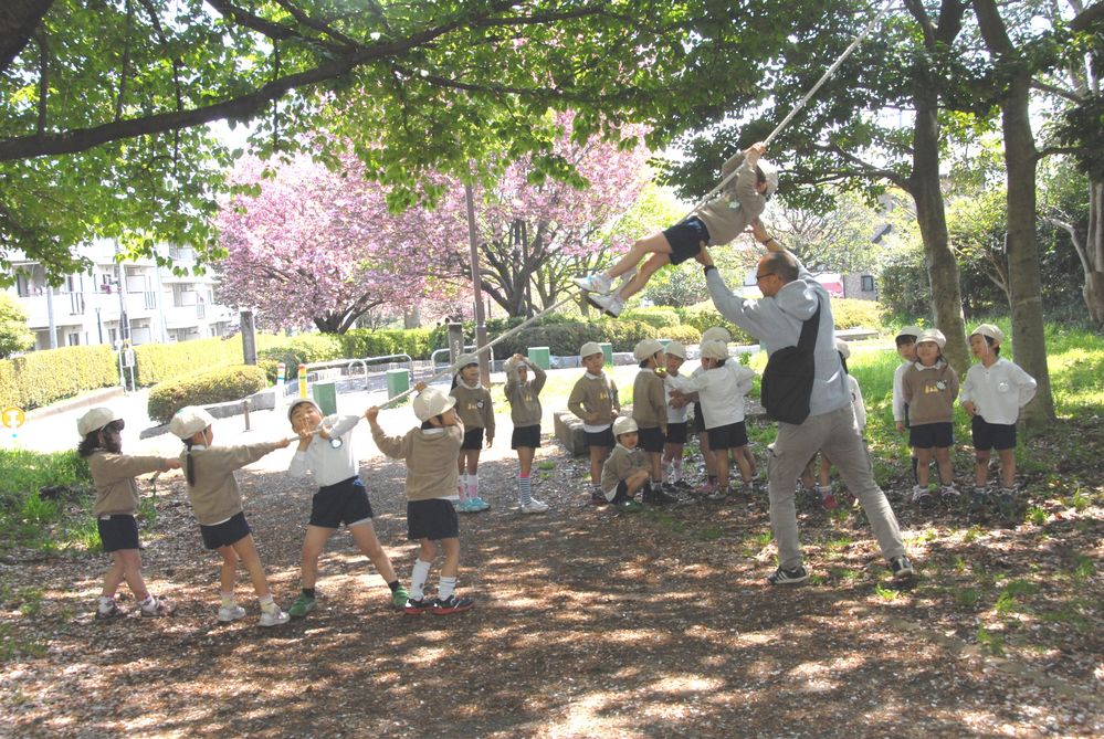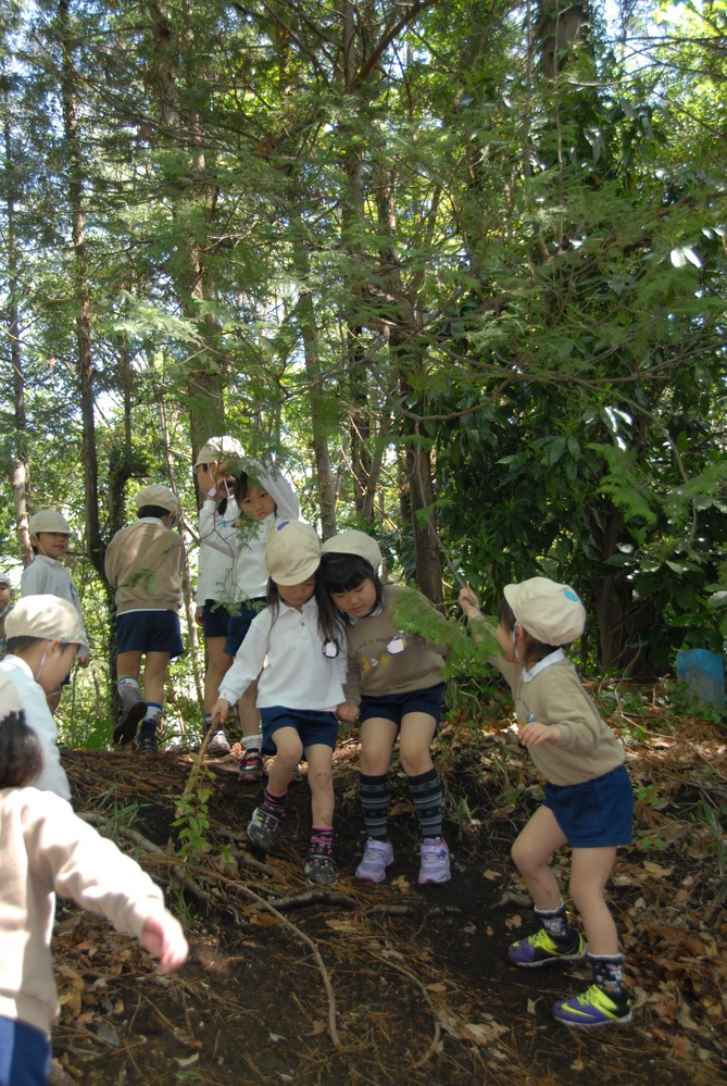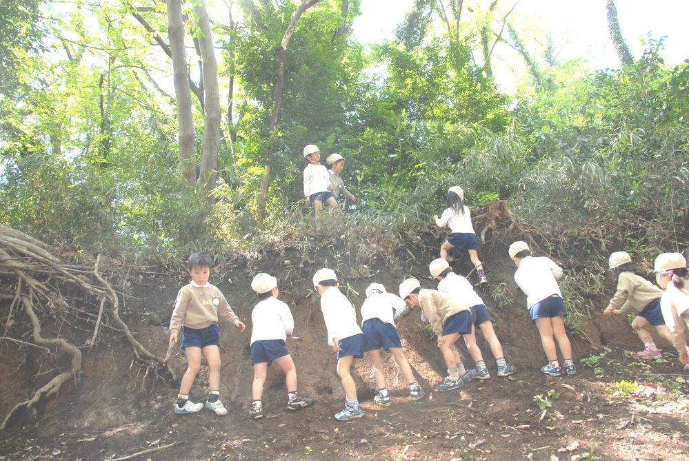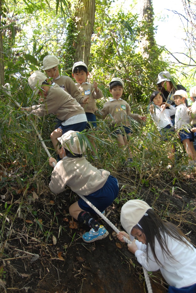 23日、年長組は園外保育に出かけました。 歩いて30分ほどの、緑が美しい「さえずりの森」。 子どもたちはロープで遊び、崖を滑り降り、のぼり・・・、と思い切り遊びました。