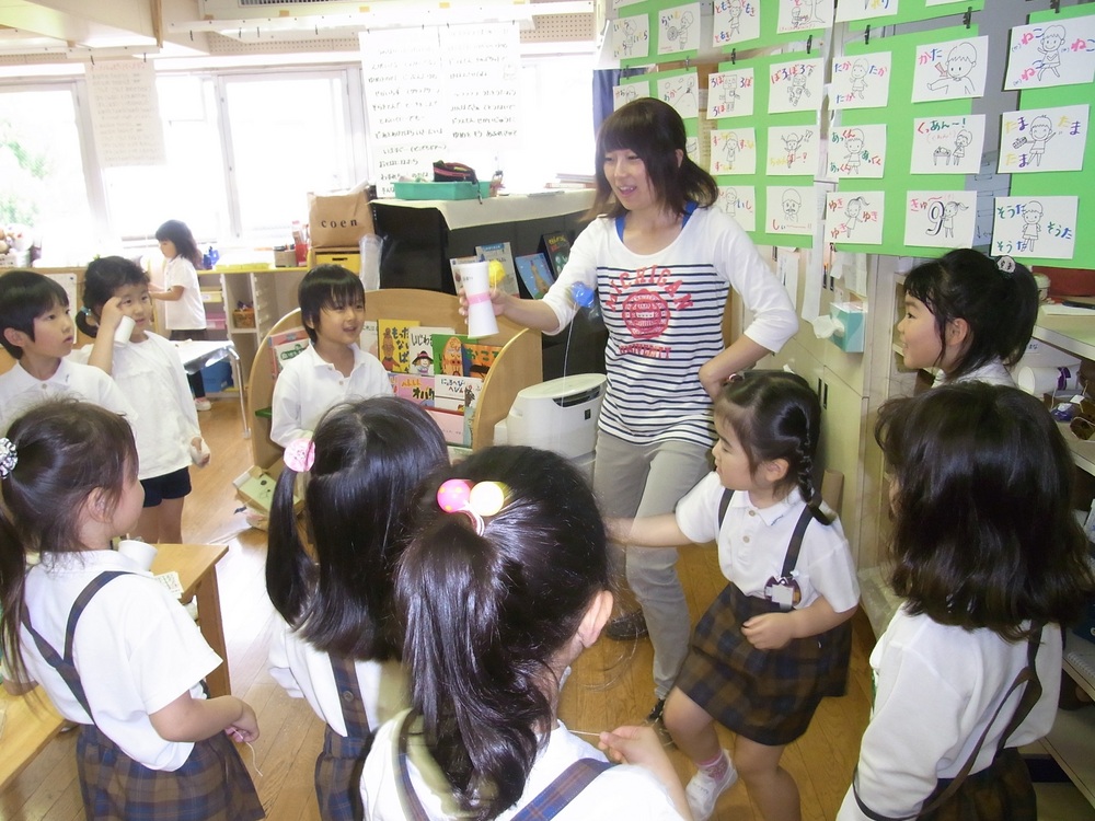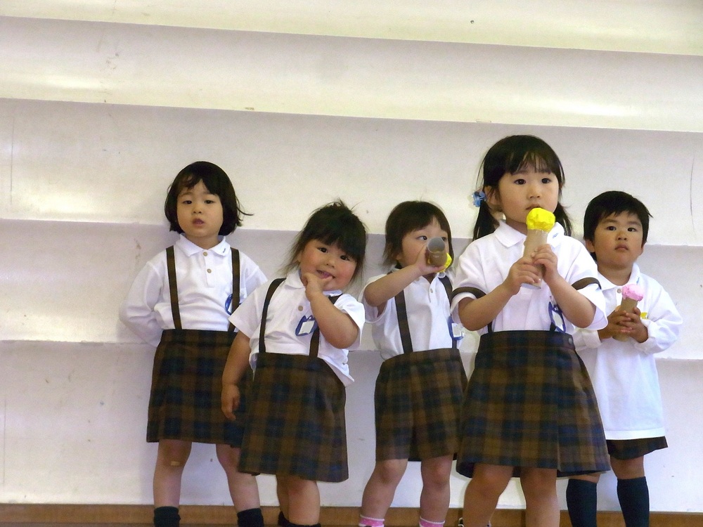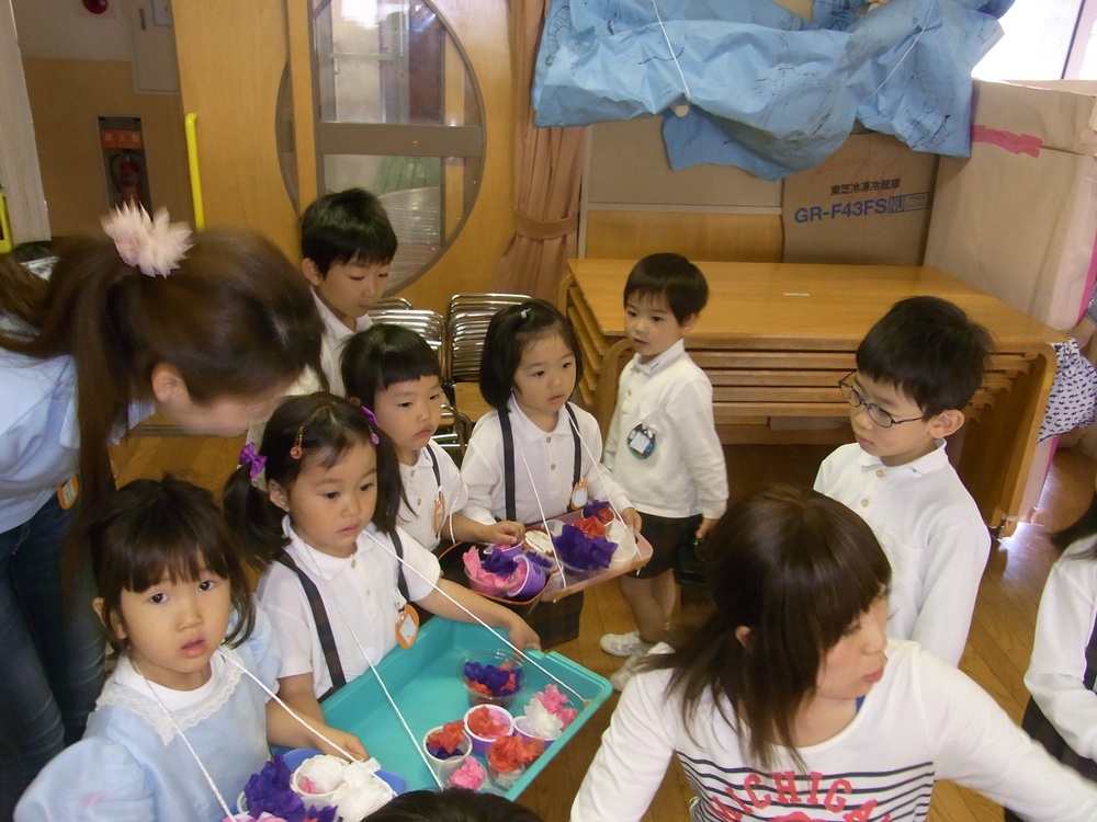 年少組も行動範囲が広がり、ホールでショーを開催して歌を披露したり、年長のクラスにジュースの出張販売にもでかけます。