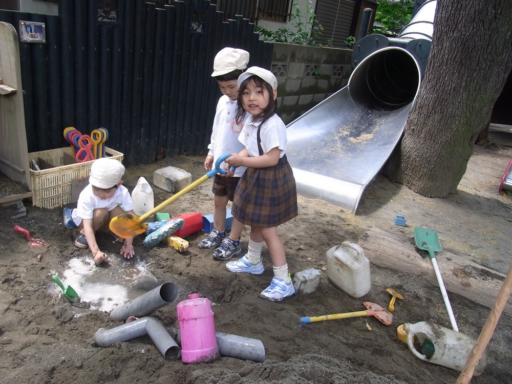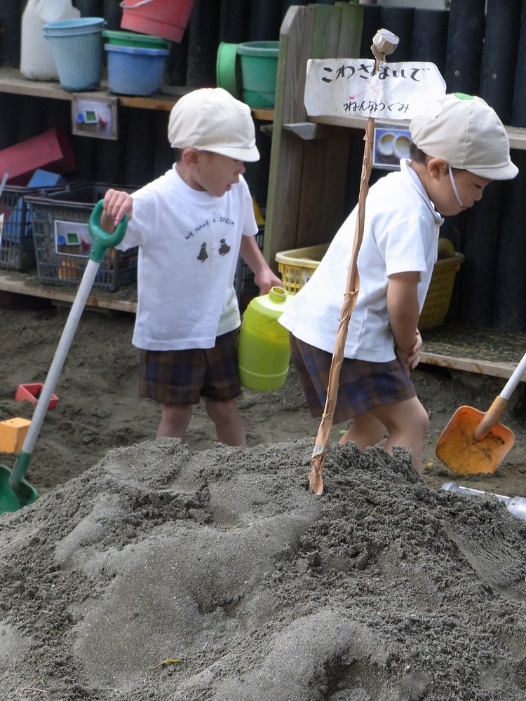 砂場は年長が一旦区切りをつけたものの、続きをしたくて大きい砂山を残しているため、その周りでうま~く遊ぶ子どもたち。偉いね。
