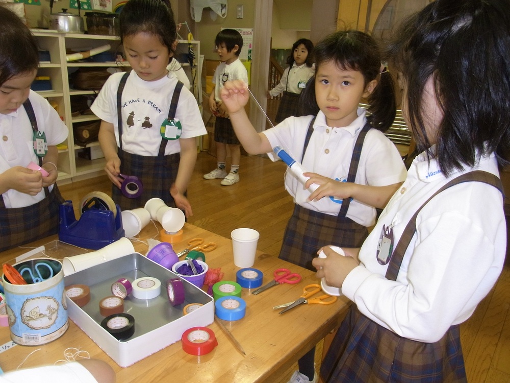 部屋でけん玉つくりをしていたクラスでは、「先生もがんばれ!」と応援していました。