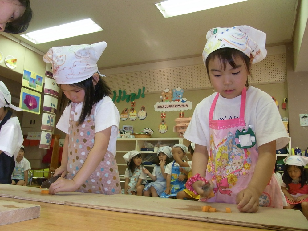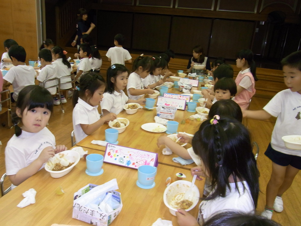 その興奮を治めて、エプロンをつけてのカレー作り。包丁を持つ顔は真剣です。カマドのお釜に①切った野菜②まき③カレールーと3回入れにいきます。「おいしくなーれ」の呪文が効いたらしく、3クラスともおいしいカレーができあがりました。何杯も何杯もおかわりするくらい、そしてふだんはカレー嫌いの子も、もりもり食べたくなるおいしさでした。