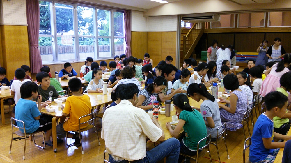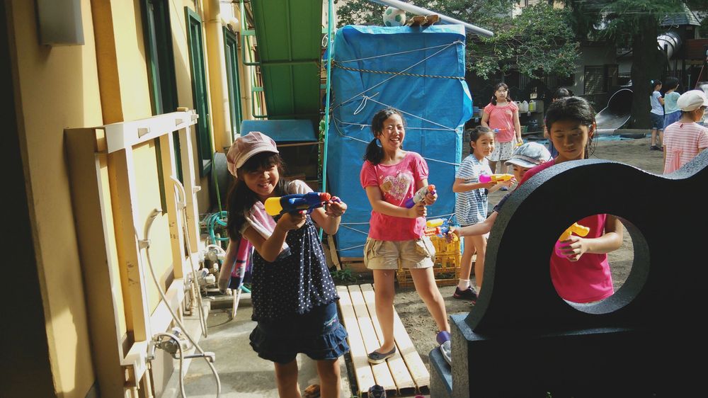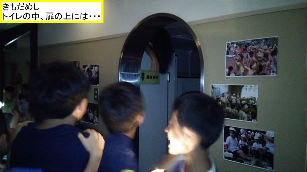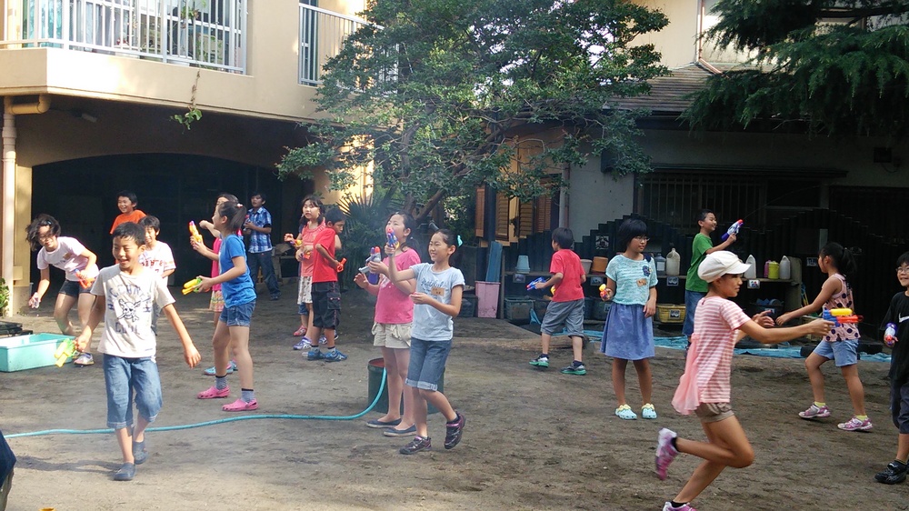 園庭で水鉄砲合戦やドロケイをして、カレーを食べ、こま大会をし、肝だめしをしながらワード集めのゲーム。