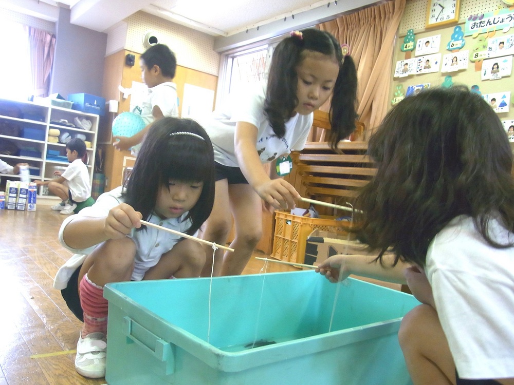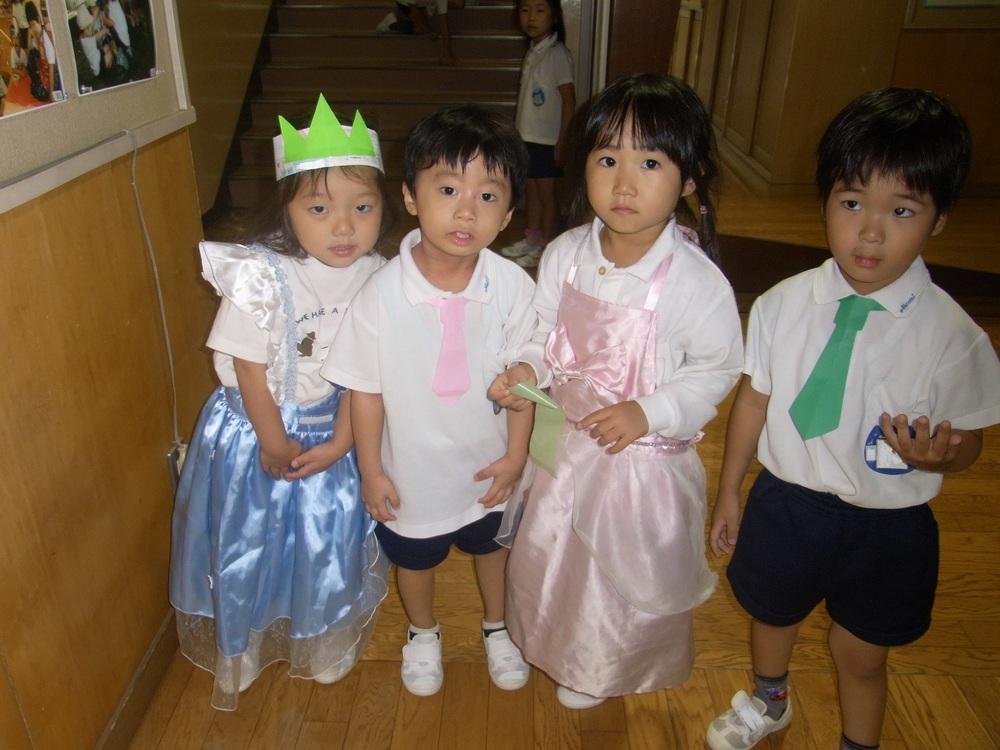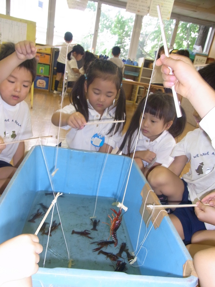 年長の先生が捕ってきたザリガニたち。今年は小さめでしたが、みんな真剣な顔でザリガニ釣りに挑戦していました。ほかの学年でも衣装や小物を身に着けて、姫や紳士に変身する姿も・・・。