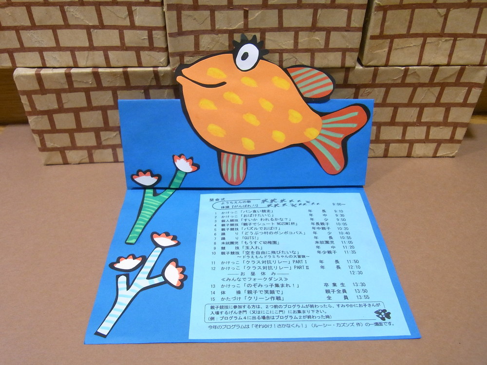 運動会プログラムができました。今年は絵本「それゆけ!さかなくん」から愛らしいお魚のデザインです。