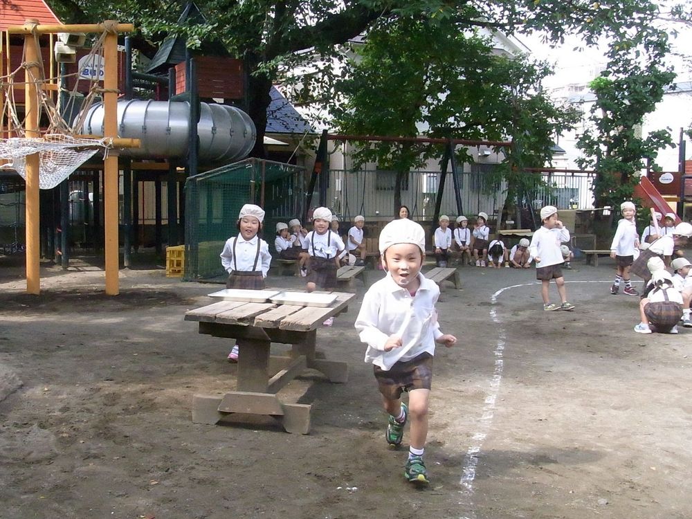 年中組は、卒業生たちの競技で園児席の目の前で間近に見た「グミ食べ」競走。おいしいものを食べられる念願の競技。「食べるときには手を使ってはいけない」という注意事項を意識して、グミに到達するずっと前から両手を後ろにして走る姿が、可愛らしかった・・・。