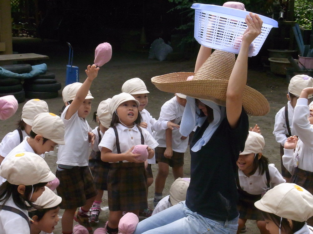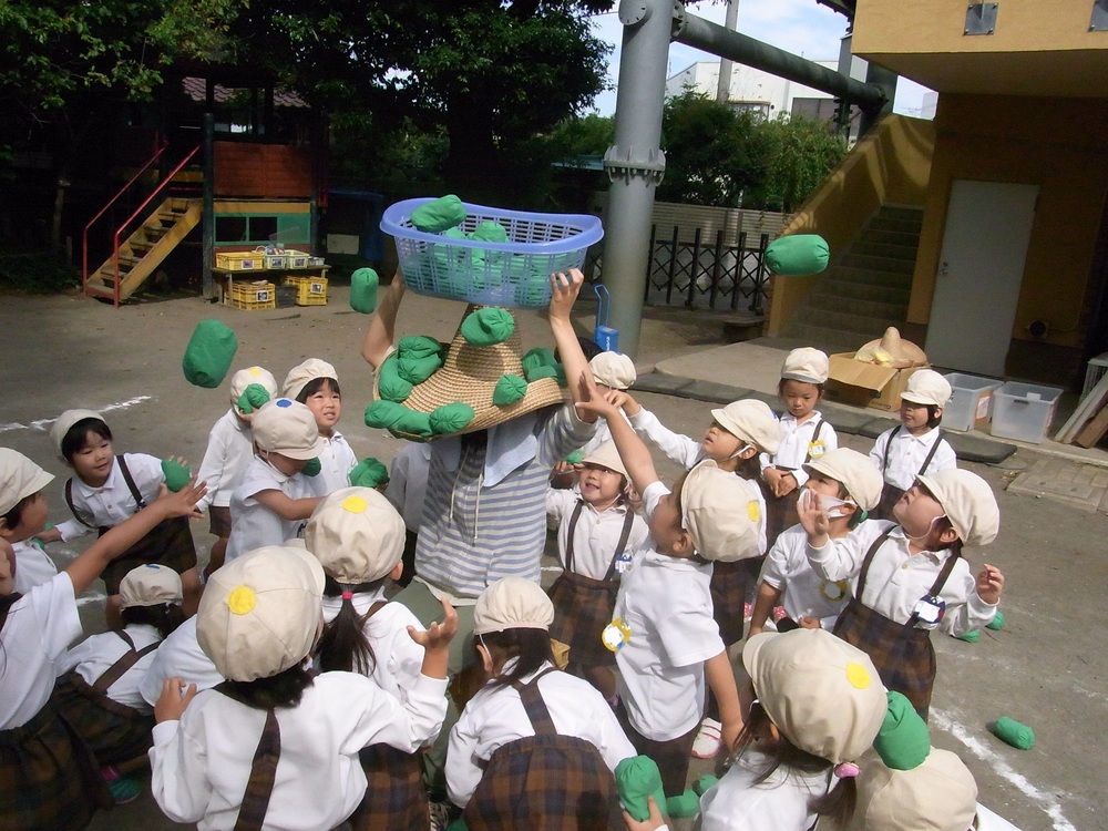 年少組は、年少サイズの玉入れ。やっているうちに、カゴを持つ先生がかぶっている帽子のツバに玉を載せることに夢中にになってしまいました。