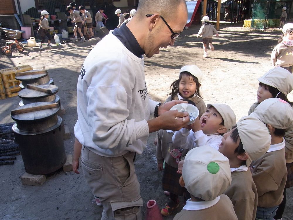 園庭のかまどで炊いた新米。味見と称して群がる子どもたちでした。