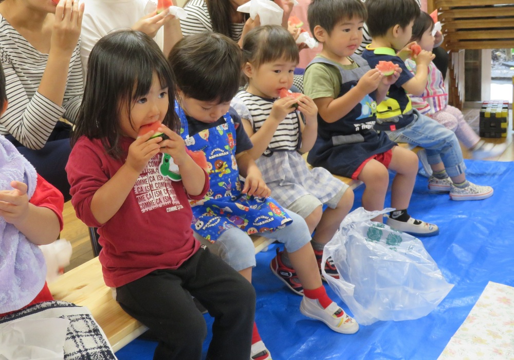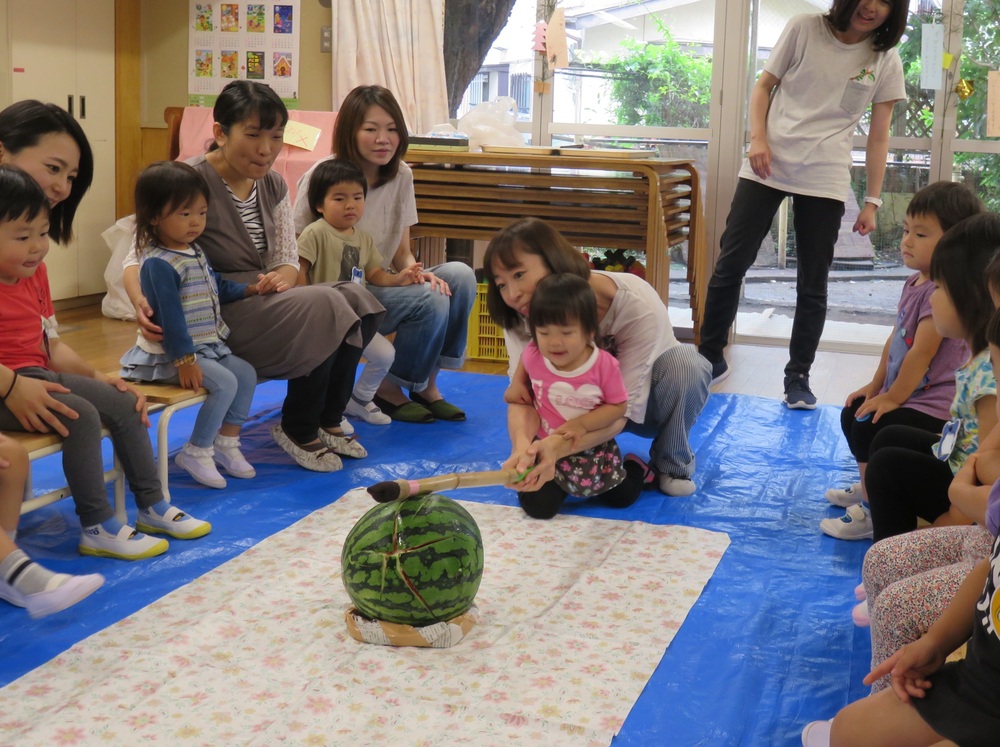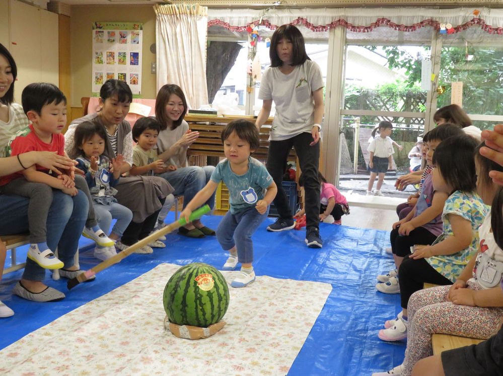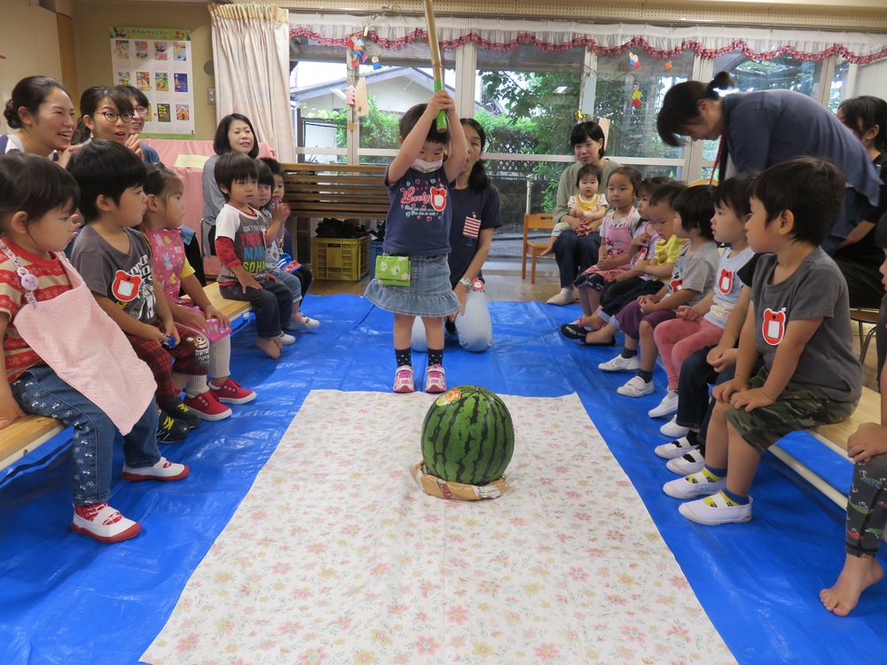 未就園のぽっぽひろばでも「スイカ割り」をしました。